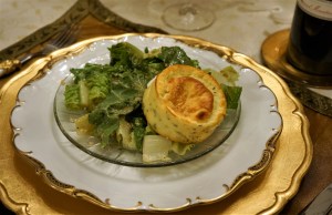 Note: We have served the souffles with mixed greens and Raspberry Vinaigrette, alongside a Caesar salad (middle picture) and with the Roasted Pear that we shared with you in a previous post. Obviously, it is very versatile and can be accompanied however you like!