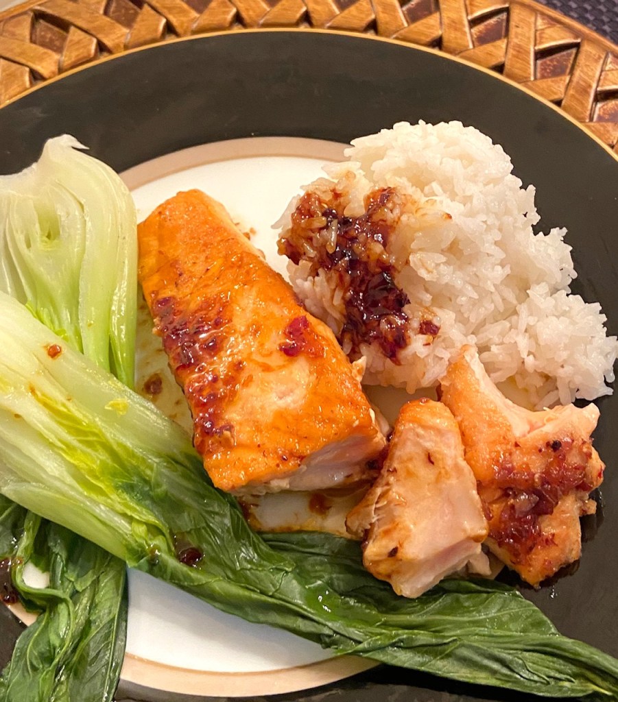 The first course was a small bowl of steamed Sake mussels (not pictured), followed by an Edamame salad with fresh baby spinach (not pictured) and the main course was Spicy Salmon Teriyaki with Steamed Bok Choy and a side of Jasmine rice. I am not a huge fan of Salmon, (it’s Malcolm’s favorite fish) but the sauce elevates the dish to a whole other level. It is spicy and flavorful and pairs perfectly with a glass of Chardonnay.