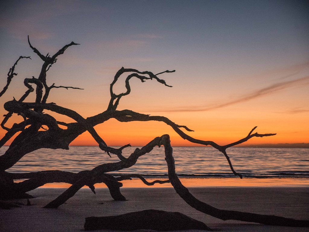My favorite place to shoot a beautiful sunrise is Jekyll Island, GA. I look forward to making my way down the narrow path to Driftwood Beach on a cool, quiet morning; lighting my way with a cell phone flashlight, setting up the tripod and enjoying a cup of coffee as I wait in the darkness for the light to dawn. Silence is a welcome companion.