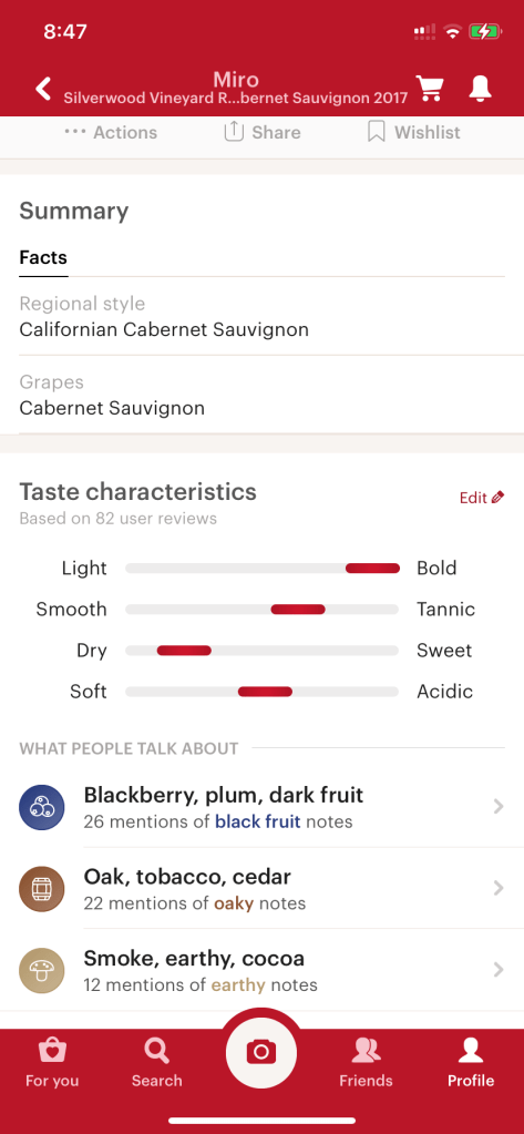 My first step was to install Vivino on my phone. It is a user friendly, free app that shares information about wines. I took a photo of a label from a wine that we frequently have at home and the app produced the review below. I was most interested in the third page which shows the taste characteristics, because I usually describe red wines that I like as bold, slightly fruity, slightly dry and smooth. After looking at the characteristics and reading a few reviews, it makes sense that I like this wine. I don’t love it, but I like it and can usually find it at a price much less than advertised here, which makes it a nice ‘go to’ when I want something easy to sip. I repeated this exercise with a few other wines that I like and have the data saved on my phone for when I go wine shopping. If I can’t find the exact wine I want, I will be able to match something similar in taste and price.