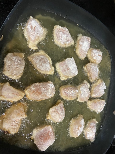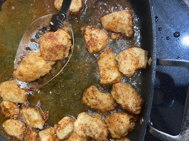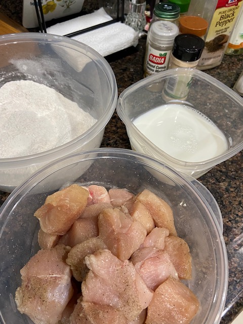 Mix dry ingredients (flour and seasonings) together in a container. Pour milk into another container alongside. Dip chicken pieces into flour, then milk, then back to flour. Drop pieces into hot oil and cook until golden. Rest on paper towels to drain excess oil. Do this in batches, until all pieces are cooked. Place cooked chicken onto a serving platter and make the honey sauce.