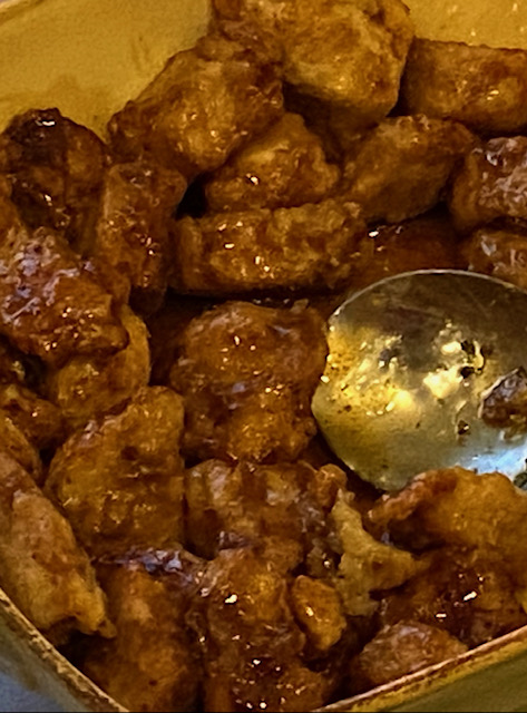 I contributed a platter of Honey Chicken to our Chinese-themed Mahjongg party buffet. It is a simple dish to make but can get a bit messy. If you don’t like frying, this dish is not for you.
