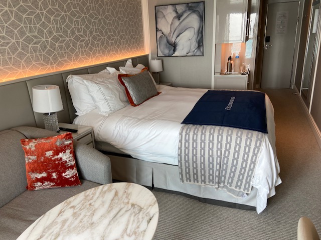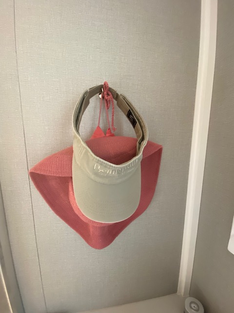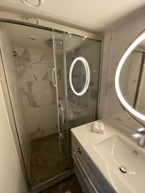 We loved our balcony stateroom and especially enjoyed the oversized shower. There was a full-sized sofa, a desk, a small refrigerator, and plenty of storage space. I used about five of the nine magnetic hooks I brought but we did not need the outlet extender. A USB port and an outlet were easily accessible on both sides of the queen-size bed. All of my zip-lock baggies filled with tee shirts, underwear, and other essentials fit nicely into the drawers of the bedside cabinets and the closet held the bulk of our clothes and shoes. The dressing table had a center drawer that held my makeup and hair tools, freeing up space in the bathroom, which we left unused. Extra storage in the bathroom was a nice surprise that I didn’t need but would use on a longer cruise.