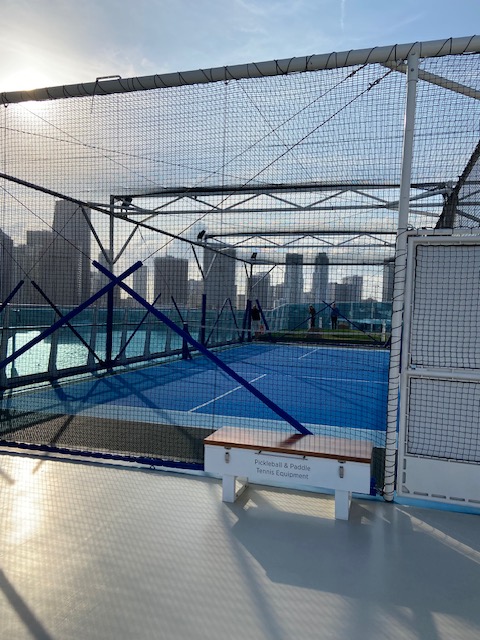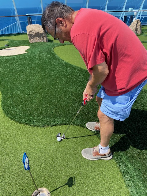When we weren’t relaxing or having another wonderful meal, we found activities to keep our bodies moving. The Pickle Ball court was challenging on windy days, but we managed a couple of games. Mini golf was always a good choice. As usual, we do not agree on who had the most wins. The walking track, although small was Malcolm’s first choice for daily activity, while I liked to alternate between the track and the gym. Malcolm tracked his steps via a phone app and averaged 10,000 per day.
