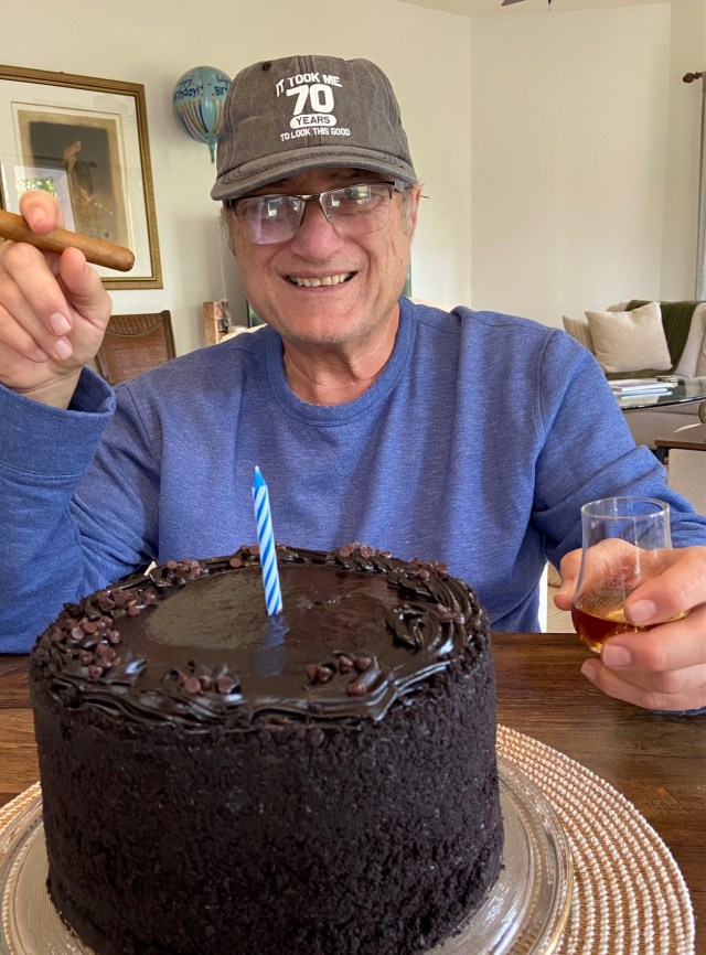 We celebrated Malcolm’s 70th birthday, spreading the festivities out over most of the month. His wish – a chocolate cake from Surfside Diner and a visit to Peebles for barbecue ribs. The man has simple needs and never makes a request for anything. This I can do. We shared the cake with some friends, and still had leftovers for days. I staged the photo below of Malcolm with his favorite birthday gifts. His friends know him well. A nice cigar, a glass of bourbon, and chocolate! He makes turning 70 look easy.